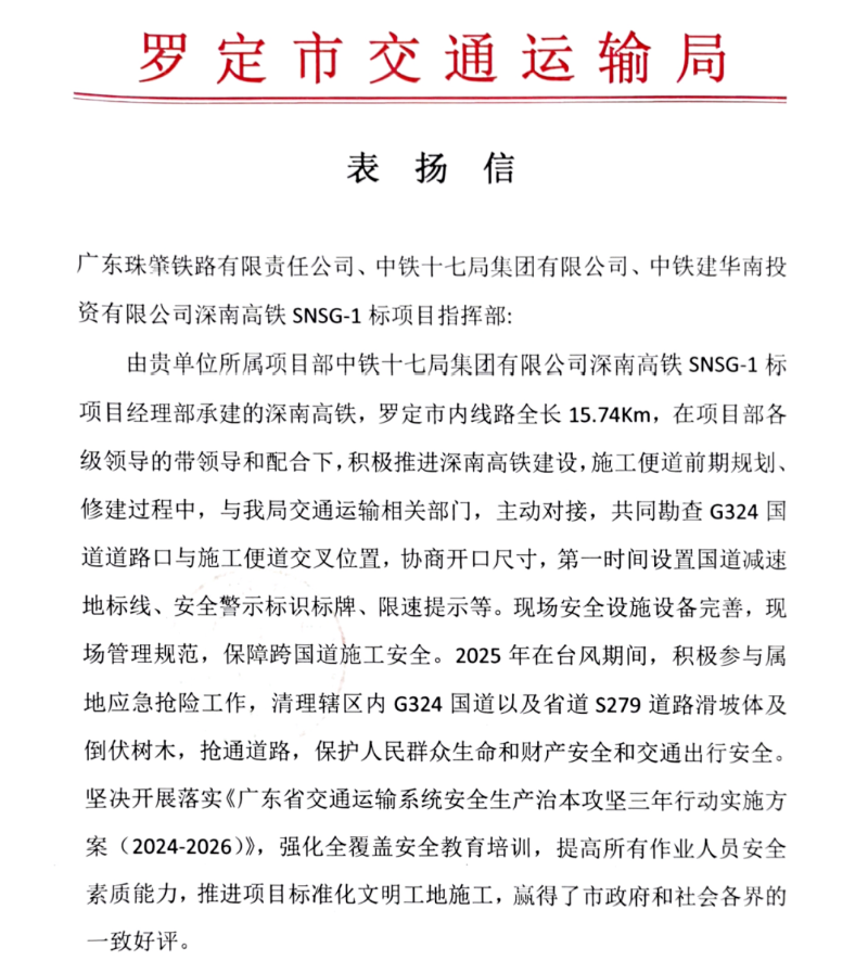 12月18日,羅定市交通運(yùn)輸局向深南高鐵指揮部及相關(guān)單位發(fā)出表揚(yáng)信,對其在深南高鐵羅定段建設(shè)中作出的突出貢獻(xiàn)予以充分肯定。信中指出,指揮部在跨國道施工安全保障、臺風(fēng)期間應(yīng)急搶險響應(yīng)等方面積極主動,展現(xiàn)了高度的責(zé)任擔(dān)當(dāng);同時嚴(yán)格落實(shí)安全生產(chǎn)治本攻堅(jiān)三年行動要求,扎實(shí)推進(jìn)標(biāo)準(zhǔn)化文明施工,贏得了政府與社會各界的一致好評。信中贊揚(yáng)各單位以“不忘初心、不畏艱難”的鐵道兵精神,為深南高鐵助力粵桂區(qū)域協(xié)同發(fā)展奠定了堅(jiān)實(shí)基礎(chǔ)。